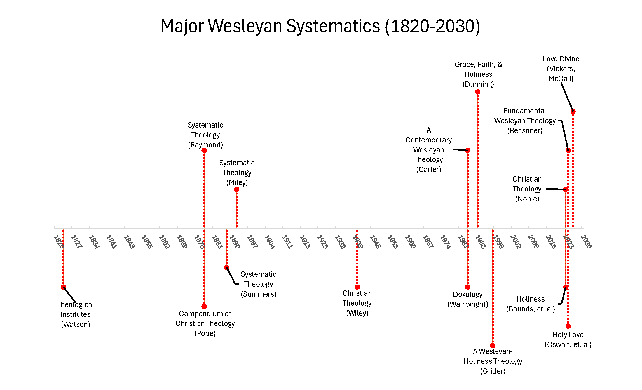’s recent interview with Dr. John Oswalt (found below)—there have been at least five Wesleyan systematic theologies released, begun to release, or announced to be released just in the past three years or so (if you know of any more, please let me know). Given the timeline we explored earlier, where the 19th century was the golden age of systematic theology, followed by a sparse 20th century, this sudden resurgence of systematic theology is hugely significant for Wesleyanism. I have attempted to illustrate how divergent the last five years are, even compared to the 19th century, with the timeline below. Inevitably, the timeline is not comprehensive and will be missing a work or two (hopefully not your favorite), but nonetheless illustrates the massive uptick in writing and publishing since 2023.As I have not had the time to read any of these new systematic theologies, I will, for now, forgo an attempt to review them or recommend them. Several of them are multi-volume works that are to be released in volumes in the coming years. It will take time to see if any of them stand the test of time like Watson’s Institutes, which uniquely preceded these new systematics by being republished in 2018 by Lexham Press in a new edition with an introduction by noted Methodist New Testament scholar Ben Witherington III. Without any additional commentary, I will simply list these recent systematics for the record.