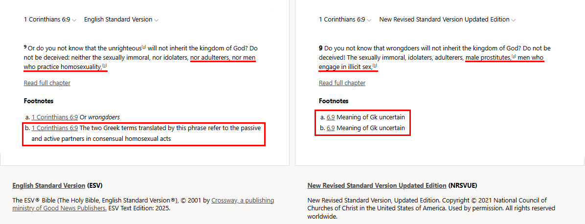 Unfortunately, the NRSV’s successor, the NRSVue, took significant revisionist liberties with the biblical text that do not reflect accurate translation, opting for liberalism and mistranslating the sacred words of Scripture. In the most egregious instance, they devilishly affirm modern anthropology and sexual confusion as they translate 1 Corinthians 6:9 in this way: μοιχός (adulterer) as “male prostitute” and ἀρσενοκοίτης (homosexual) as “men who engage in illicit sex.” They comment on the translation with the same footnote on both: “meaning of Gk uncertain.” The truth here is the Greek is only uncertain to someone who fell asleep in their first-year Greek class or is just dishonest and is trying to rewrite Scripture to fit their agenda.4 In contrast, the ESV footnote of the same pericope conveys important context known to scholars. What gives? Has scholarly understanding changed? No, the NRSVue is actually just choosing to completely ignore all scholarship and do what they want.