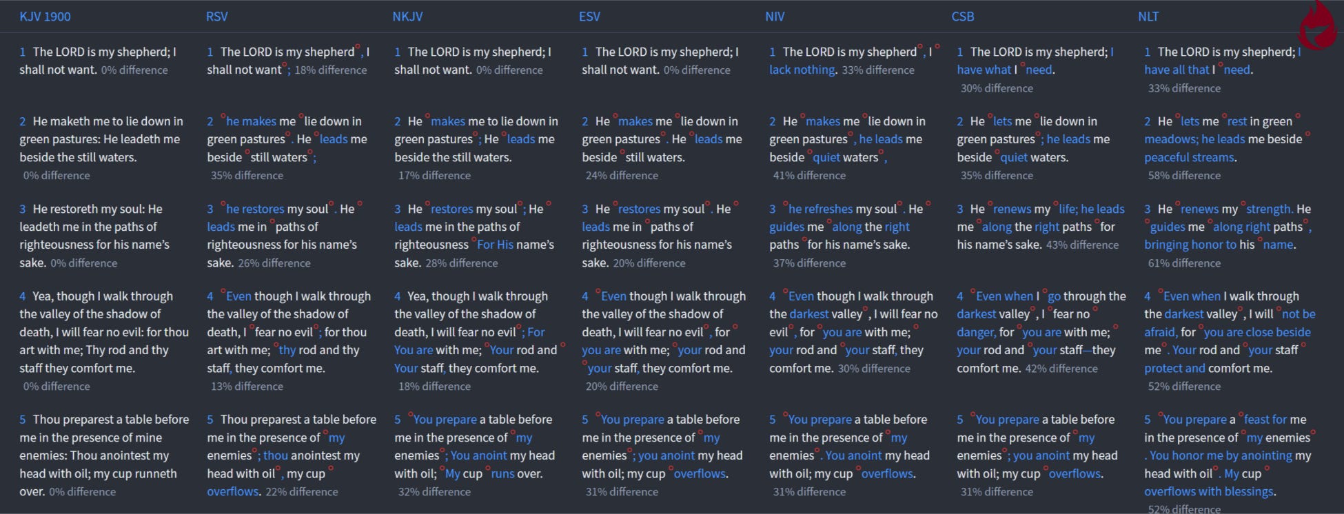 The CSB’s translation of Psalm 23:, which reads, “The Lord is my shepherd; I have what I need,” will never be ingrained in our imaginations like “The Lord is my shepherd; I shall not want” (KJV, RSV, NKJV, ESV, NRSV, etc.). The main differences of Psalm 23 in the Tyndale-derived translations are in punctuation, grammar, and pronouns, while the new translations introduce completely new English phrases and words in translation. These translations are not inaccurate to be doing so, but they are eroding the cultural memory, or at least not supporting it, hence why they do not qualify as a standard Bible in my criteria.